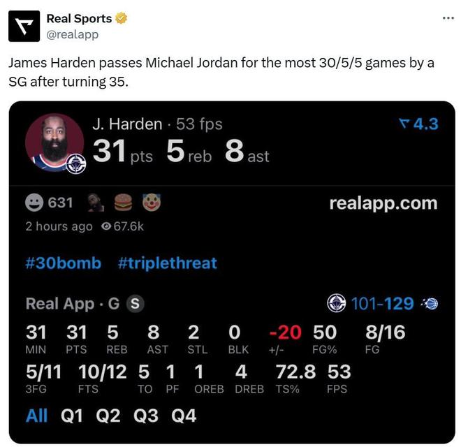 本场三节打卡拿下31+5+8后,36岁零87天的哈登已经连续4场交出28+得分表现,成为NBA历史第六人,也是连续第4场交出25+5+5成为NBA历史上完成这一壮举最老的球员。